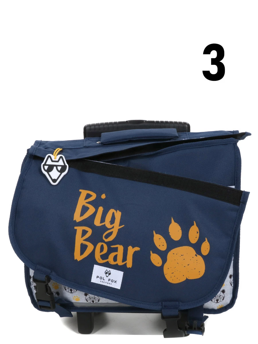 Le cartable à roulettes Réversible Pol Fox Bear 38 cm donne de l’aplomb aux petits garçons pour affronter les journées d’école du CP et CE2. Mi-câlin, mi-sauvage, l’ours qui orne son revêtement est prêt à sortir les griffes pour le défendre. Grâce au rabat bi-face, on choisira selon les jours d’afficher sa grande tête dessinée en polygones ou l’empreinte de sa patte. Pour des trajets à pied sans effort, rien de plus simple que de rouler le cartable à l’aide de son trolley réglable. Les jours pluvieux ne seront pas une menace pour son contenu, grâce à son revêtement en polyester déperlant, sa doublure intérieure et son fond imperméable.