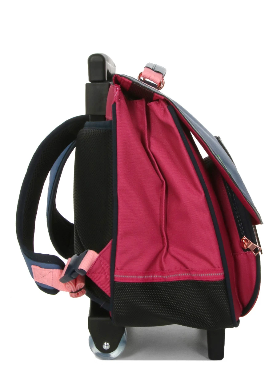 A l’intérieur, le cartable trolley Tann’s Les Fantaisies Olivia ne manque pas d’astuce avec ses poches spécifiques pour le décimètre et l’emploi du temps. Les cahiers A4 et 24 x 32 trouvent une place dans l’un ou l’autre de ses 2 compartiments doublés. Les cartouches d’encre de rechange, le tube de colle et la gomme peuvent quant à eux être sériés à part dans sa petite poche à zip. Sous son rabat à attache rapide, une dernière poche zippée est parfaite pour laisser accessible un petit goûter, un paquet de mouchoirs, un chouchou…