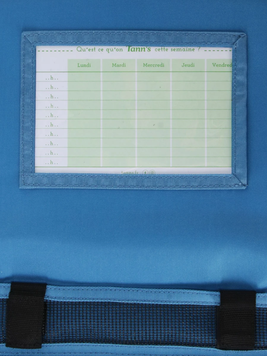 Les deux compartiments du cartable Tann’s Les Fantaisies Ryan sont fermés par une attache à tuck et doublés pour limiter les dégâts en cas de renversement de jus de fruits. Dedans, cahiers et classeurs au format 24 x 32 et A4 peuvent être organisés efficacement. Une poche intérieure fermée par une fermeture à glissière est parfaite pour garder les objets précieux tels que le goûter à l’abri des regards indiscrets. Finies, les recherches interminables dans le fond du sac pour retrouver la règle qui s’est en réalité logée dans le cahier de maths : elle est maintenue dans sa longue poche étroite grâce à deux scratchs. Sur l’avant, la poche zippée peut accueillir des feutres ou crayons de couleur. Pour que les parents puissent aider à la préparation du sac, un emploi du temps à compléter est situé dans le rabat intérieur. Enfin pour aider la maîtresse, qui elle aussi, mérite qu’on lui facilite la vie, un porte étiquette montre au premier coup d’œil à qui le sac appartient.