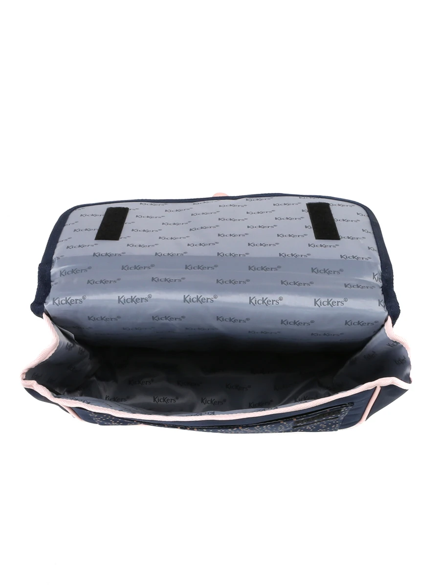 Le compartiment unique du cartable fillette Kickers Girl est compatible avec le format A4 : il accueille les cahiers, classeurs et livres, ainsi que la trousse. Intérieurement doublé, il permet un transport soigné des affaires. Sous le rabat est également aménagée une grande poche plate ouverte, pratique pour glisser quelques indispensables : l’agenda, un paquet de mouchoirs ou un en-cas. Pour faciliter son ouverture par les jeunes mains, le rabat se ferme simplement par des bandes velcro.