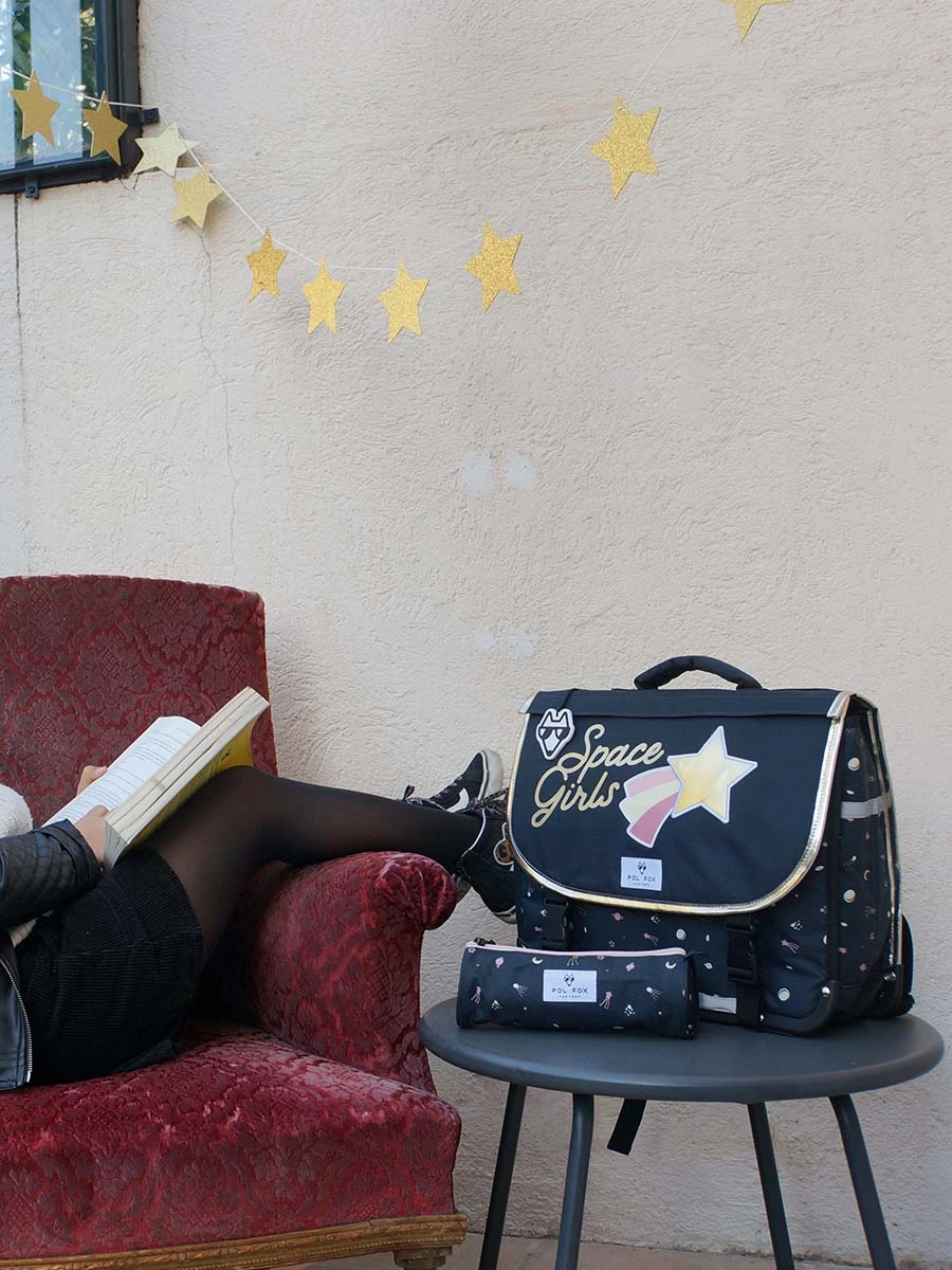 Le cartable Réversible Pol Fox Space Girls 38 cm séduit les petites filles fascinées par l’espace avec son rabat bi-face affichant d’un côté une étoile filante, et de l’autre une multitude d’astres colorés. Il est idéal pour les classes du CP au CE2 et compatible aux formats A4 et 24 x 32. Les cahiers sont protégés de l’humidité (notamment pendant les jeux olympiques de saut en flaque d’eau) grâce à son fond imperméable, son revêtement en polyester, et sa doublure intérieure.