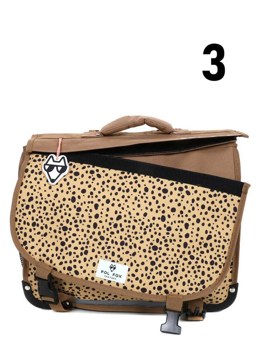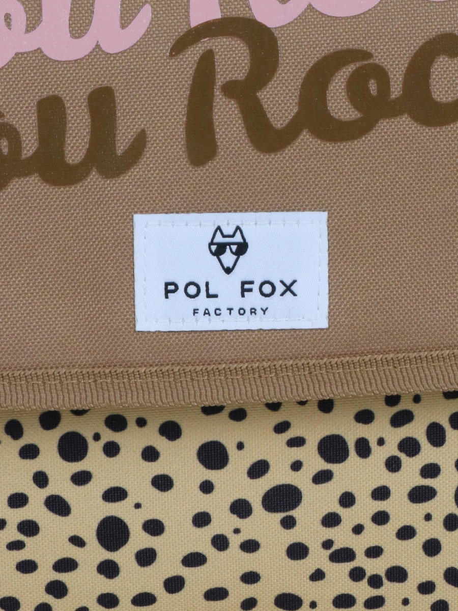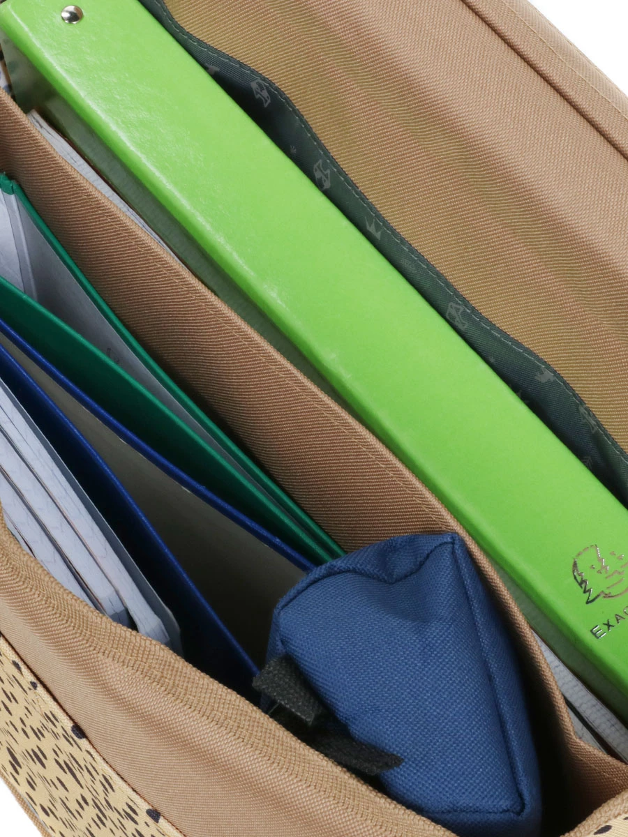 Le cartable Pol Fox You Rock offre sous son rabat à attaches deux espaces de rangement dans lesquels peuvent loger tous les supports scolaires de formats A4 et 24 x 32 cm : classeurs, livres et cahiers. La trousse et les accessoires annexes tels que l’équerre, le compas et les crayons de couleurs se rangent à part dans la grande poche plate sous le rabat. Une poche filet latérale accueillera au besoin une gourde ou un en-cas.
