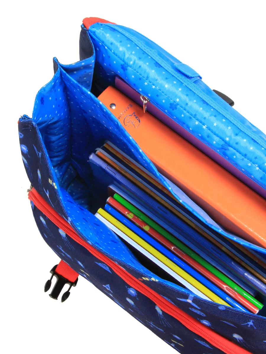 Le cartable CE2 – CM2 Snowball Kid Robot Dino possède deux compartiments doublés pour organiser les cahiers. La petite poche zippée est parfaite pour éviter de perdre la carte de cantine par exemple. La règle a son passant dédié qui la maintient avec des bandes velcro. Cahier de texte et pochette de crayons de couleur trouvent quant à eux leur place dans la poche frontale. Pour éviter tout oubli au moment de la préparation des affaires pour le lendemain, il est équipé d’un porte-planning.