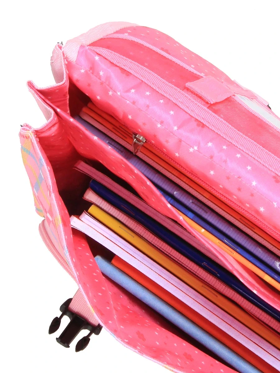 Les deux compartiments doublés du cartable ergonomique Snowball Romantique Licorne permettent de retrouver rapidement les livres et cahiers soigneusement organisés dedans à l’aide du porte-planning situé derrière le rabat. Pour les petits accessoires importants, il est muni d’une poche intérieure zippée. La règle ne risque plus d’aller se dissimuler dans le classeur de français puisqu’elle est maintenue par des scratch dans son passant réservé. Sous le rabat, une poche zippée permet de garder le goûter en accès rapide.
