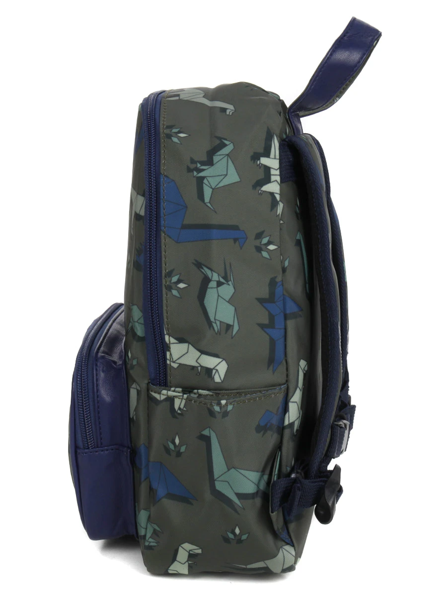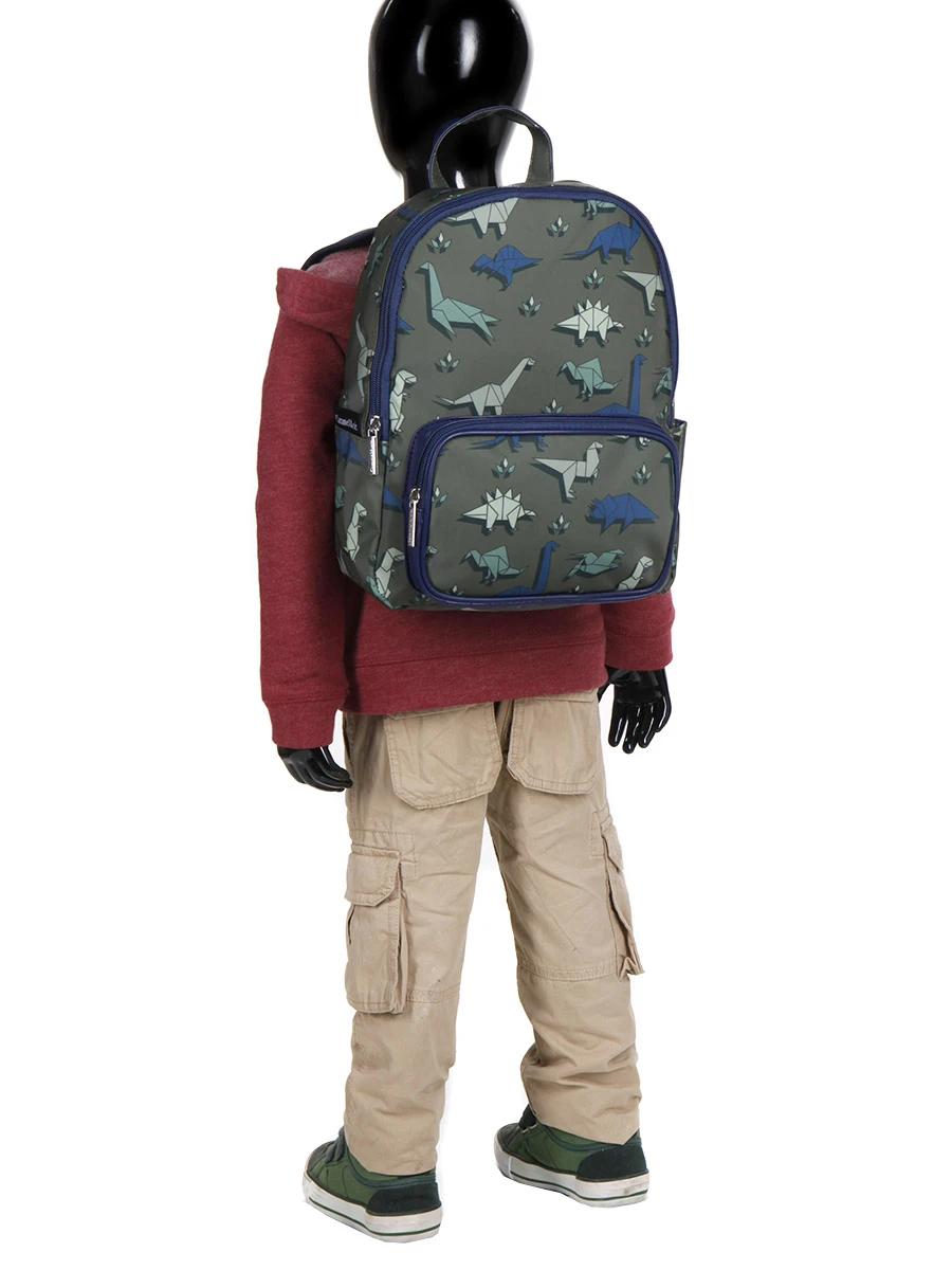 Le compartiment du petit sac à dos maternelle Caramel & cie Dinogami accueille aisément le doudou, les petits cahiers de brouillon et la trousse. Pour le goûter, une petite gourde et la carte de cantine, il est muni d’une petite poche latérale et d’une poche frontale zippée.