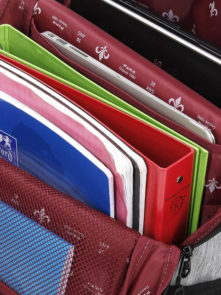 Le compartiment ordinateur du sac citadin Lys Lexington est moussé pour offrir une place confortable et sécurisée à un ordinateur jusqu’à 15.6 pouces. Le second compartiment dispose d’une porche zippée en mesh, idéale pour accueillir le chargeur de l’ordinateur. En face, une grande poche plate peut maintenir des dossier bien droits, et trois petites poches sont parfaites pour des accessoires tels que batterie nomade (non incluse), portefeuille, ou petit carnet par exemple. Un livre peut trouver sa place dans la poche frontale à ouverture latérale. Sur les côtés, deux grandes poches extensibles en maille filet sont pensées pour des gourdes ou petites bouteilles d’eau.