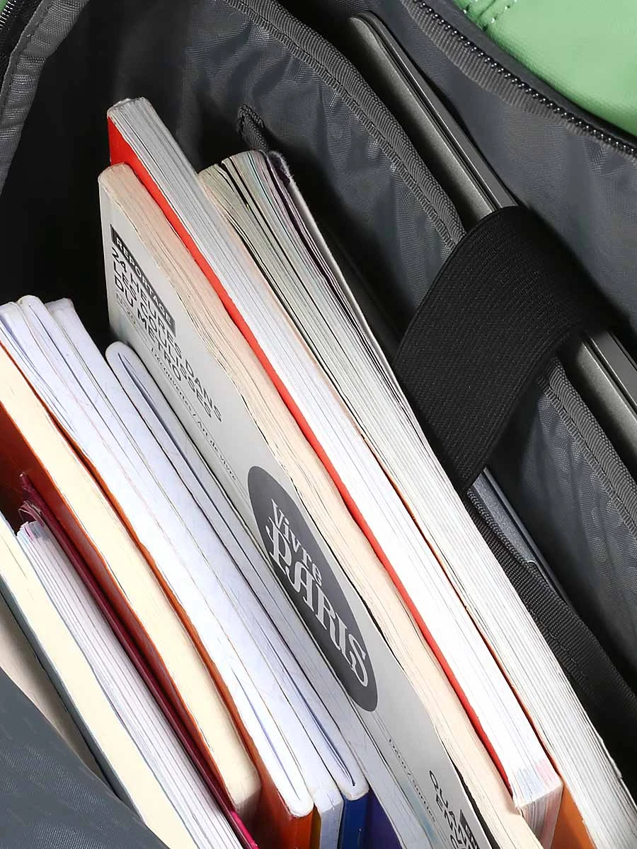 Le compartiment principal du sac ergonomique Samsonite Ecodiver L est assez grand pour pouvoir accueillir une veste ou tenue de rechange. Il dispose en prime de deux poches rembourrées : l’une pour un ordinateur jusqu’à 15.6 pouces, et l’autre pour une tablette. Une bande élastique terminée par un scratch permet de les maintenir en place pendant les péripéties du voyage. Le second compartiment, plus petit, peut quant à lui loger des documents au format A4, il est par ailleurs muni d’une grande poche plate pour les garder à la verticale. En face, une poche zippée en maille filet est parfaite pour le chargeur de l’ordinateur. Deux passants pour stylo, quatre poches pour les cartes, et une poche format carnet viennent compléter ce compartiment. A l’extérieur, une petite poche frontale est parfaite pour les clefs ou autres petits objets en accès rapide. Une poche latérale renferme un porte bouteille extensible en maille filet. Une dernière poche discrète est dissimulée dans le dos, elle est pensée pour les objets importants tels que le portefeuille par exemple.