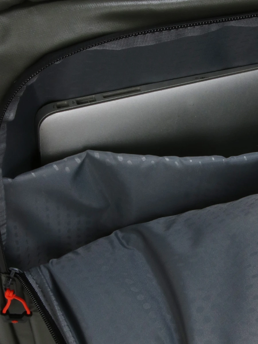 Le sac de voyage trolley Samsonite Ecodiver dispose de deux compartiments séparés par deux cloisons en mesh qui permettent d’éviter tout renversement à l’ouverture. Ils sont vastes et peuvent accueillir les vêtements nécessaires pour un court séjour. La grande poche frontale est équipée d’une poche rembourrée pour ordinateur jusqu’à 15.6 pouces.