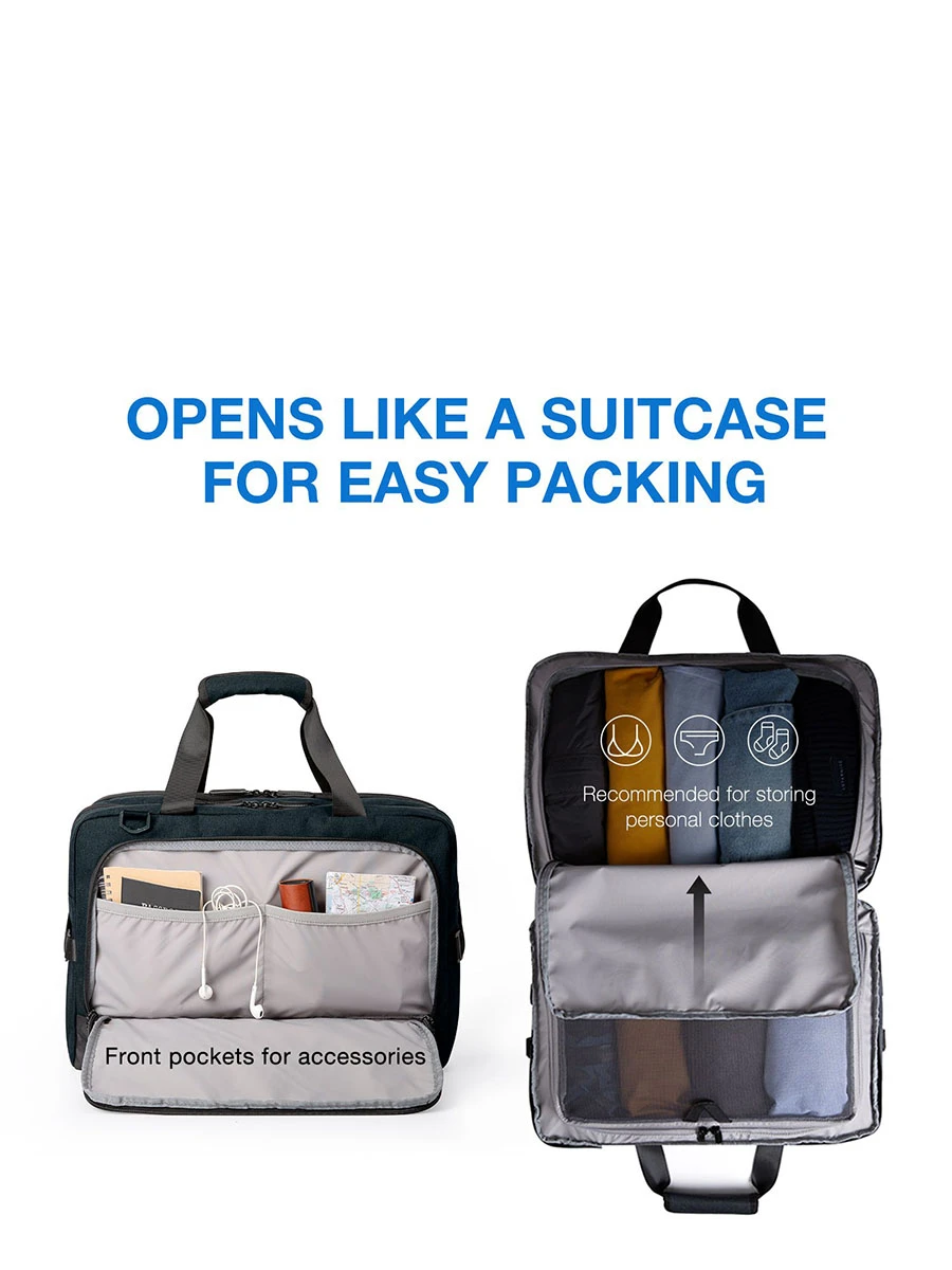 Le sac Bagsmart Falco s’emporte partout avec aisance avec ses 2 larges anses munie d’une patte de maintien Ă attache velcro facilitant sa prise en main et sa bandoulière rĂ©glable Ă taille et dĂ©tachable munie d’un coussin ergonomique pour un portage tout confort Ă l’Ă©paule ou en travers. Lors de longs dĂ©placements, il peut tout aussi bien ĂŞtre fixĂ© au trolley d’un bagage Ă roulettes pour garder les mains libres. Sur les cĂ´tĂ©s, ses sangles de compression permettent de l’aplatir – ce qui est notamment bien pratique quand ses compartiments pour le linge ne sont pas utilisĂ©s. En cas de pluie, son contenu reste bien au sec grâce Ă son fond renforcĂ© et sa doublure textile.