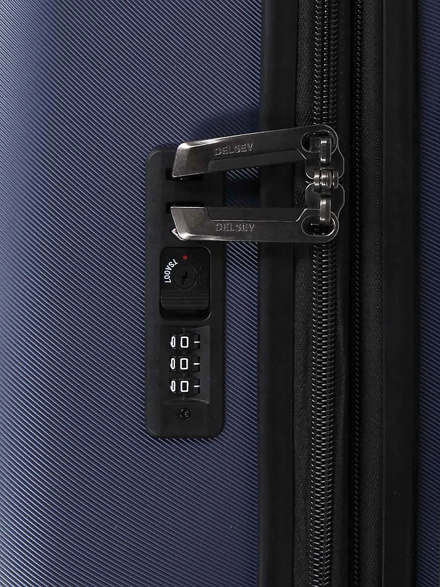 La valise Delsey Air Armour offre une glisse sans accrocs avec ses 4 doubles roulettes multidirectionnelles et sa poignée télescopique double tube. Pour franchir une volée de marches aisément, elle est en plus dotée de 2 poignées souples et douces au toucher. Sur le dessus, une serrure TSA à code encastrée permet de verrouiller l’accès à son contenu en un tour de main. Pour une sécurité supplémentaire, il est possible de glisser un cadenas (non fourni) dans ses curseurs percés si la nécessité se fait sentir.