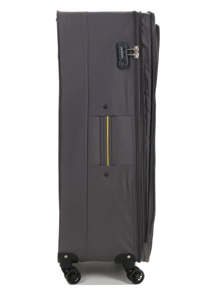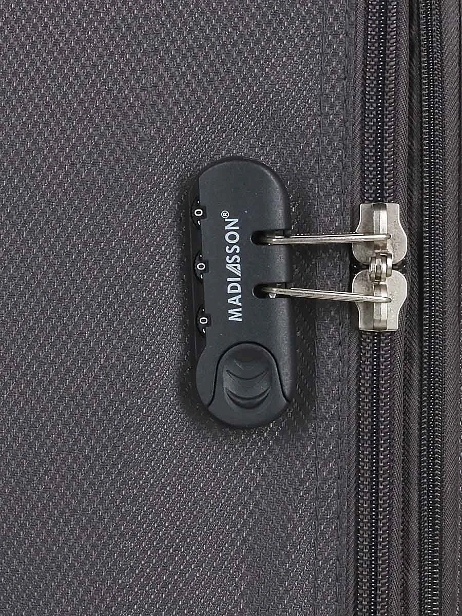 La valise extensible Madisson Bristol se tracte avec aisance grâce à ses 4 roues doubles pivotantes à 360° et sa poignée télescopique double canne. Pour la déposer sur un rack à bagages ou dans le coffre d’un véhicule, elle peut être tenue par ses 2 poignées de portage. Sur le côté, une serrure à code permet de verrouiller l’accès à son contenu. A l’arrière, un porte adresse permet de laisser accessibles les coordonnées de contact de son propriétaire en cas de contrôle de sécurité. Enfin, des renforts latéraux rigides lui confèrent une protection supplémentaire en cas de choc.