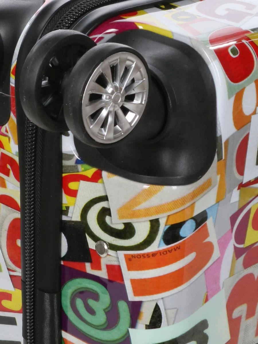 La valise Madisson Newspaper Letters 55 cm se distingue par son design original mêlant sur sa coque brillante des lettres et des chiffres multicolores. Ce décor joyeux permet de plus de rendre le bagage aisément repérable lorsqu’il se trouve parmi d’autres. Finis les moments d’hésitation devant le tapis à bagages de l’aéroport ! Elle offre un petit gabarit bien aménagé qui convient parfaitement aux déplacements de quelques jours. Grâce à sa conception légère en ABS et polycarbonate, elle se soulève sans effort et son système de tractage garantit un roulage fluide. Ses dimensions lui permettent d’être acceptée en cabine par toutes les compagnies aériennes (Air France, Ryanair, EasyJet). Pour ne rien gâcher, elle est proposée à un petit prix.